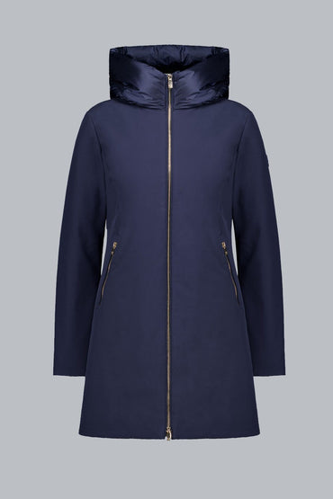 MIRE 2.2 – Giacca lunga con cappuccio imbottito, realizzata in tessuto softshell 3 layers con laminazione dry-tech. Il capo è caratterizzato da chiusura con zip oro...